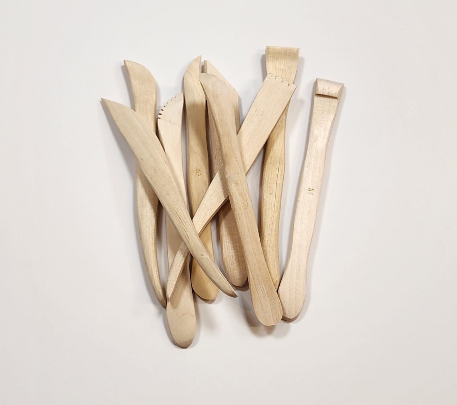 כלי עץ בודד לעבודה בחימר מסוגים משתנים.